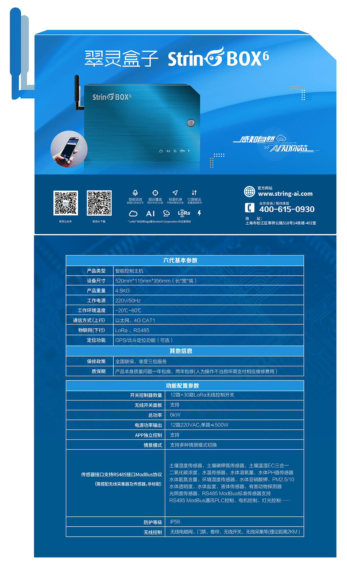 “翠灵盒子6代”是由滴翠推出的一款环境智能监测管理终端,主要用于土壤、水、空气等环境生态数据的采集与 电磁阀灌溉系统、水务水泵控制系统、环境降尘雾化系统、植物补光照明系统、种植环境温控系统等农林设备的智能 化控制,并结合植物生长大数据、云计算决策等为一体的人工智能综合网关,主要应用在智慧农业、智慧城市等场景。